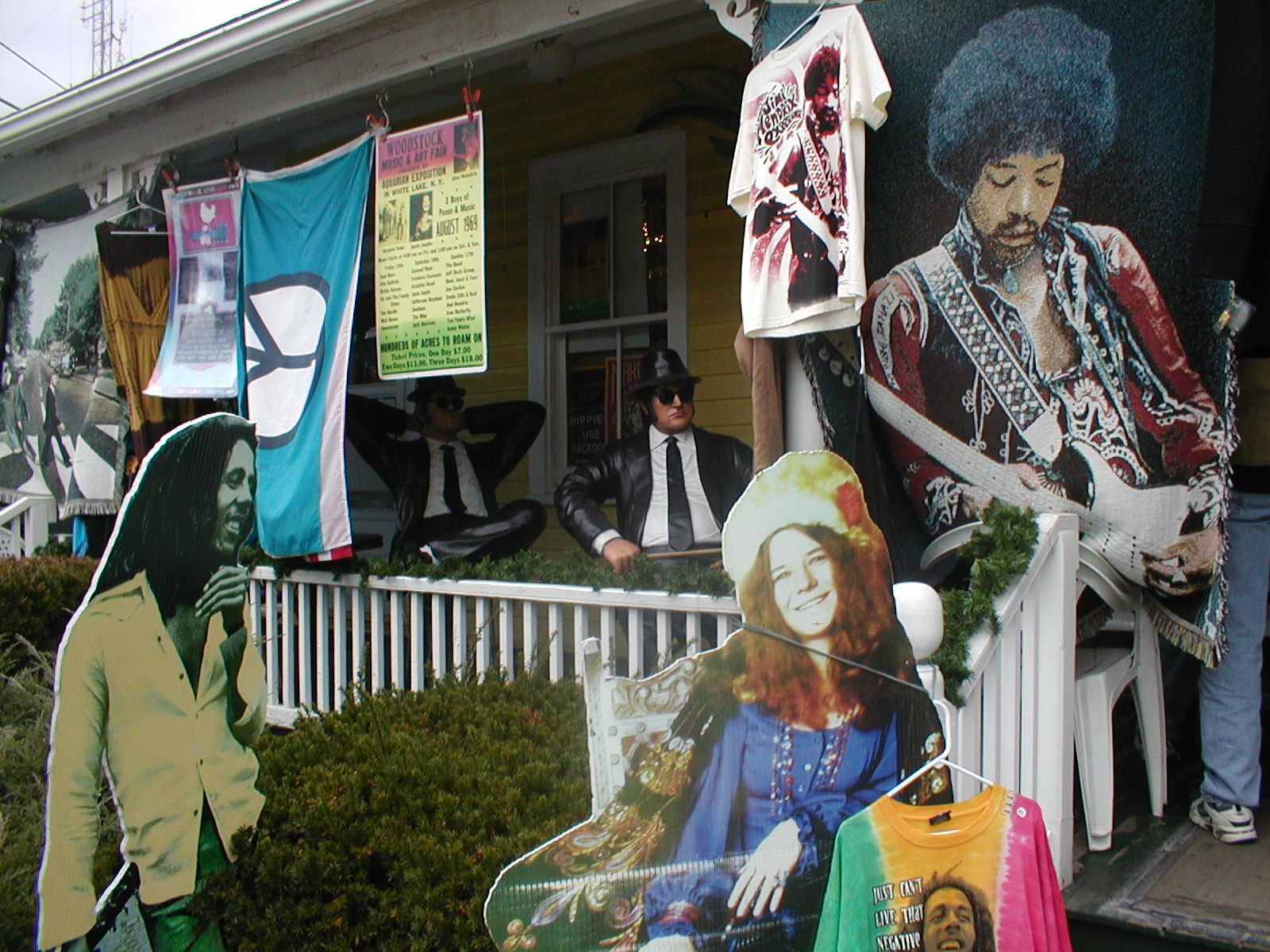 - at the top: a crazy, buy everything made in China shop that displayed every possible item relating to the real or imagined Woodstock experience. Here tourists can wrap their arms around a cardboard cut out of Janis & Jimi sit next to the Blues Brothers, or stand in front of a towel with the Beatles image woven into it. The shop covers all bases. Inside you can buy a t-shirt with everyone on front, including the Dalai Lama. Bob Marley’s there, too
