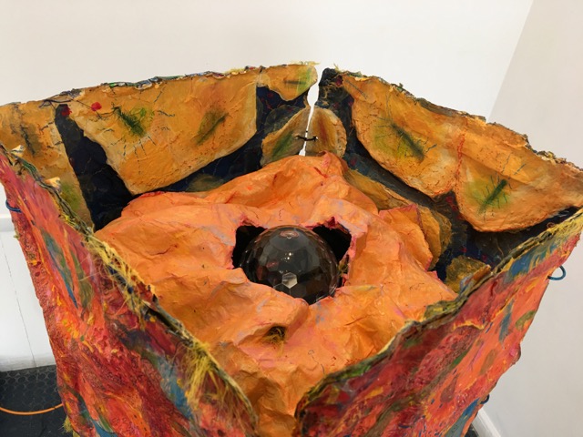 The Pandora Light –Like the Prometheus Light, The Pandora Light is fashioned from sidewalk print of the Harvard Science Center. The outside is painted with sea creatures, the perceived underworld; the inside is painted with images of germs, the unseen underworld. Deep inside the box are both female tissue and male sperm. The light–the center of it all, the elemental product–spills out over the room.