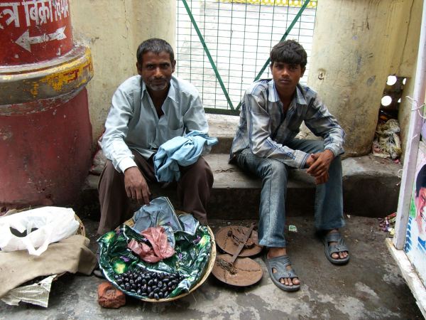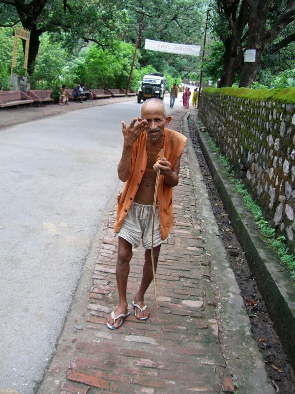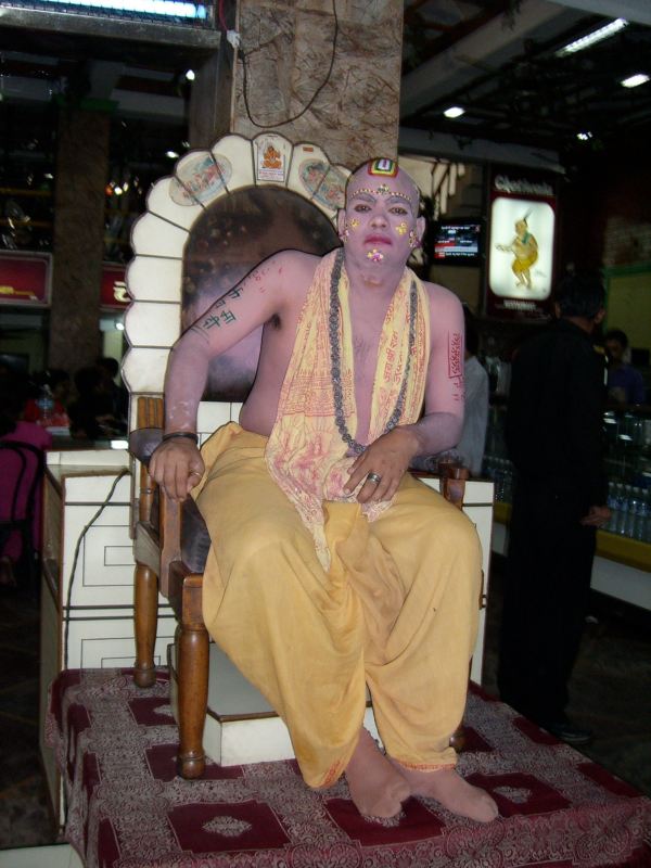 A typical ashram owner. Orange is a sacred color, symbolizing the Quest for Knowledge. It represents fire and as impurities are burnt away by fire, orange symbolizes purity and religious abstinence. Holy men in India wear orange. Not all me who wear orange are holy. Some men take up the color to get away from family responsibility ( taking care of children) and to give credence to begging professionBeggar in Orange ( perhaps a Holy Man, or wanting to be recognized as a Holy Man) inviting me to give him money.I din’t give him money and he turned sour.A pair of vendors in Rishikesh. They aren’t selling olives! Not sure what the black ovals are, perhaps a fruit.This happy fellow with his shoes stacked behind him is selling beans and pulses, protein staples of the Hindu diet.Time for lunch? Looks like this restaurant is a favorite spot for Indian tourists.One of the strangest things I saw in India was this man who was very decorated and with painted skin sitting on a dais outside a restaurant. He was the restaurant’s ‘live’ advertisement . Notice his socks. Maybe he is Lord Krishna?Small Hindu Temple. I was satisfied to have visited and to have not found a suitable ashram in Rishikesh.