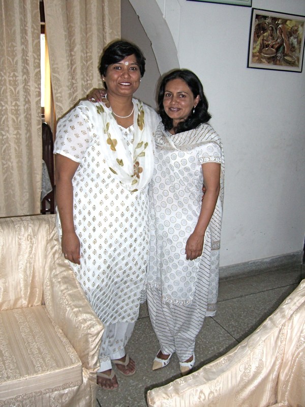 Their outfits women wear are shalwar kameez. The baggy pants are the shalwar–loose on top and tight around the ankle. (The one I bought tied together at the top with straps like those on a wrap-around skirt.) The top part of the woman’s outfit is a kameez. It’s a Western like dress, usually with fitted sleeves. Both Anjula and Babita’s lovely kameez are slit from waist to knee to allow freedom of movement. The scarf Indian women wear around their neck is called the dupatta. The dupatta is traditionally seen as a symbol of modesty (it hides the bustline) and can double as a veil, when needed. White is considered a symbol of the high caste.