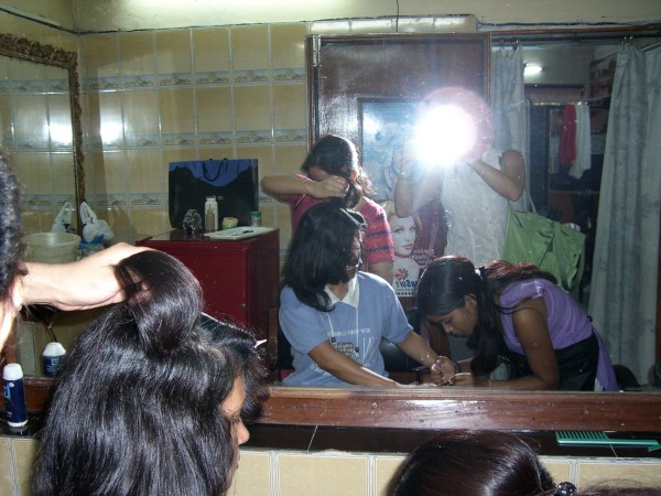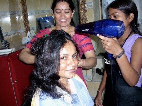 After a week in the Himalayas, Anjula and I decided to treat ourselves by spending an afternoon in a beauty salon. I had no idea what to expect from a backstreet salon in downtown Dehradun. I don’t think she did either, but she was hankering for a haircut so we did it. (Most women tend to their hair at home.) The salon wasn’t fancy, as you will see. And the place was not air-conditioned. It smelled a bit musty. We were hot. So was everyone else.
