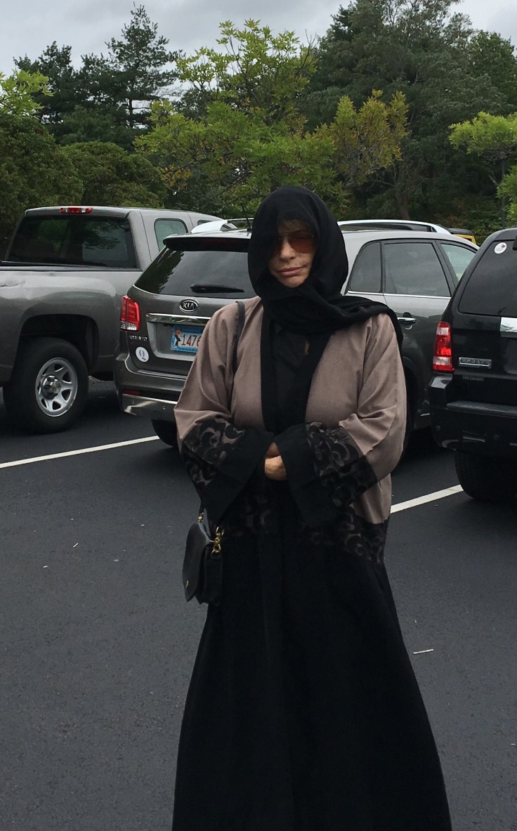 For this three-week story, I am joining a tribe, putting myself in a public situation wearing an abaya. I have never worn an abaya. An abaya is a simple, loose over-garment, a robe-like dress, worn by some women in parts of the Arabian peninsula and North Africa. Traditional abayat are black and may be either a large square of fabric draped from the shoulders or head. The abaya covers the whole body except the head, feet, and hands. It can be worn with a face veil covering all but the eyes.