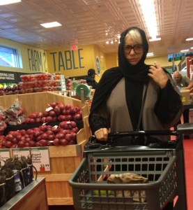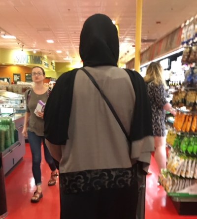 Second, back to my my mother, being a woman, and being invisible. People looked–maybe because I was a tall woman and a blonde woman in an abaya, or maybe just because I was wearing an abaya? I don’t know. The fishmonger and the male customer he was waiting on did the longest stare. Certainly it was asexual, which suggests that the male gaze they gave did not deny me my human identity since it was not riddled with sexual desire and fantasy. My other experience from inside the abaya on Day 2 was that the women who did look (except for the woman in the parking lot*) looked laterally at me as they passed, if they looked at all.