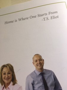 I went to an Open House for a $2.4 million Cambridge property near Harvard University. The back page of the 10-page brochure that the agents handed out to visitors featured a quote from T.S. Eliot “Home is Where One Starts From.”