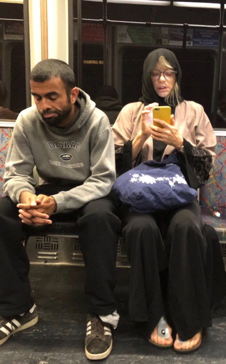 When I switched trains, I sat next to a man who might have been homeless. I’m not sure. My contemplation on this leg of the ride: As an artist I am living an experience in the cover-the-skin garment of a Muslim woman, but I could never live an experience in the skin garment of a black man.