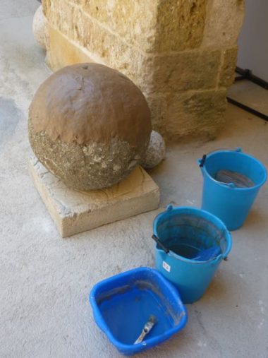 In 2015, with the permission the government archeologists, I cast the cannonballs in the Aragonese Castle of Otranto. To cast the cannonballs, I used a paper casting method typical to Puglia.I worked for a month, everyday in an orange shirt–just like the city workers who were repairing stairs and installing handicapped access.